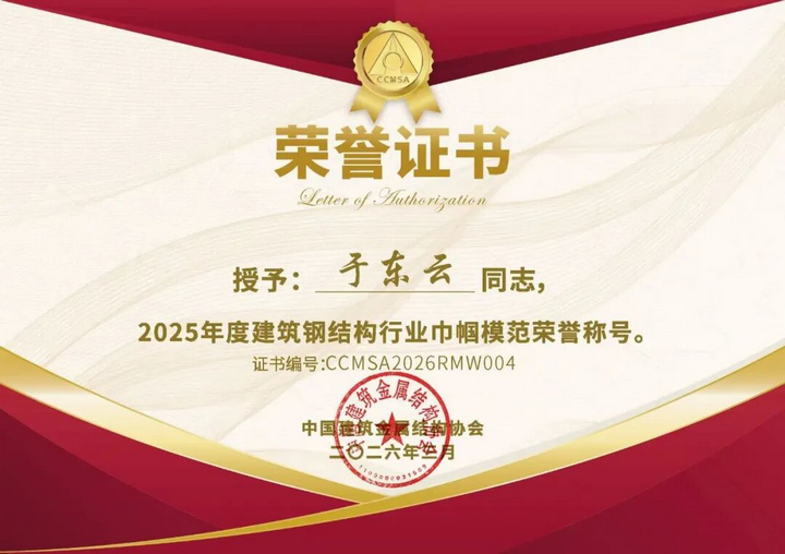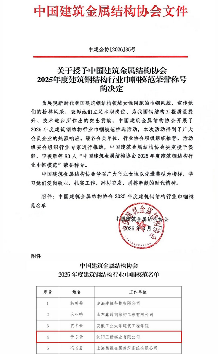 The spring breeze of March caresses the face, and the beauty of women blooms. Recently, the China Construction Metal Structure Association issued Document No. 35 [2026] of China Construction Metal Association, awarding 83 women in the industry nationwide the honorary title of "2025 Annual Model Women in the Construction Steel Structure Industry". Yu Dongyun, Chairman of Shenyang Sanxin Industrial Co., Ltd., is among them. As the 116th "March 8th" International Women's Day approaches, this national-level honor is a generous holiday gift from the industry to her, an authoritative recognition of her years of dedicated persistence and outstanding contributions in the field of construction steel structures, and even more the most beautiful praise for the new-era female entrepreneurs who combine toughness with gentleness and courageously stand at the forefront of the times.