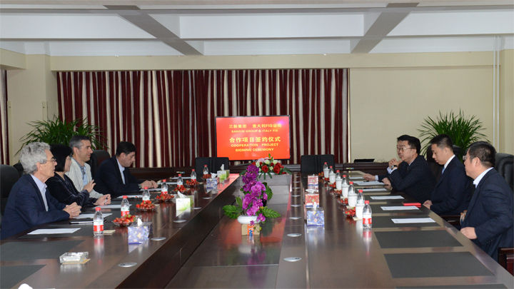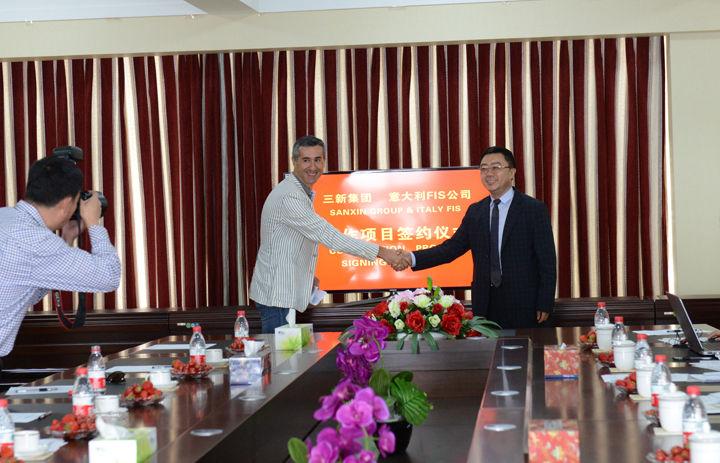 Cooperation contract signing ceremony of 'Open Metal Curtain Wall Supporting Product Project' between Sanxin Group and Italian FIS Company’ was held in conference hall of Sanxin Group Headquarters on May 20, 2014.
